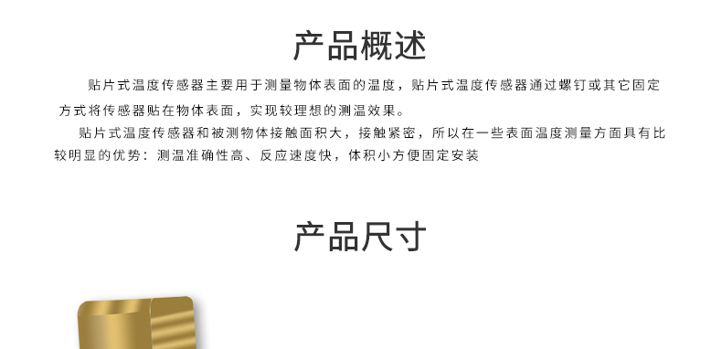 簡(jiǎn)要描述:貼片式溫度傳感器主要用于測(cè)量物體表面的溫度,貼片式溫度傳感器通過(guò)螺釘或其它固定方式將傳感器貼在物體表面,實(shí)現(xiàn)較理想的測(cè)溫效果。